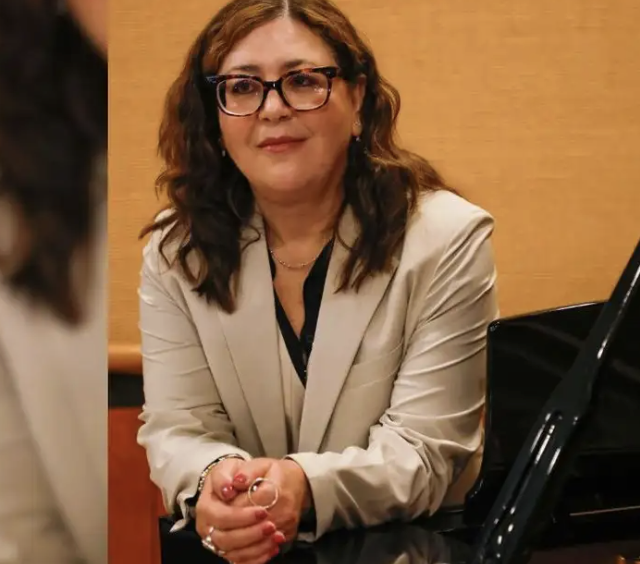 De semblante feliz y sereno, la compositora nacida en 1964 en la Ciudad de México ofreció ayer una conferencia de prensa en la Facultad de Música de la Universidad Nacional Autónoma de México, su alma mater y donde se desempeña de profesora.